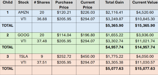 The stock price of these companies has taken a wild ride during the past 18 months. Amazon has been as low as $84.00 and as high as $232.93, Google between $86.70 and $198.16, while Tesla has unsurprisingly been the most volatile, with a value between $113.06 and $479.86. VTI was as low as $179.47 and as high as $302.45. Fortunately, each stock was higher on the day my kids wanted to look at their stocks, December 27, 2024, than at the time of purchase. I was able to show them portfolios that look like this.