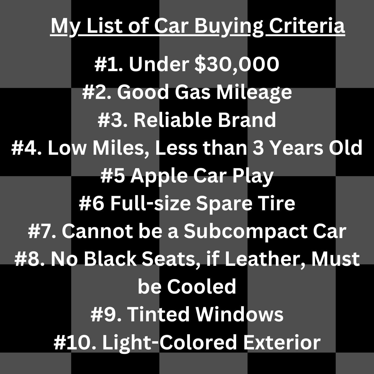 Using this, I came up with 10 essential factors, which broke down into just a few categories. Budget (1-2). Driving long distances through the Texas backcountry (3-6). Safety (7). Heat/Living in Texas (8-10). When I lived in Chicago, this list would have been very different, including heated seats and all-wheel drive.