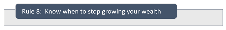 When do you have enough? Most people continue to hoard wealth throughout their life without answering this question. Chapter 8 encourages you to calculate how much your retirement will cost and find the point when your net worth is large enough. You should have a distinct point where you are as wealthy as you will ever be. Once you have crossed the Rubicon, you should spend down the accumulated money. If you don’t, what was the point of saving so much in the first place?