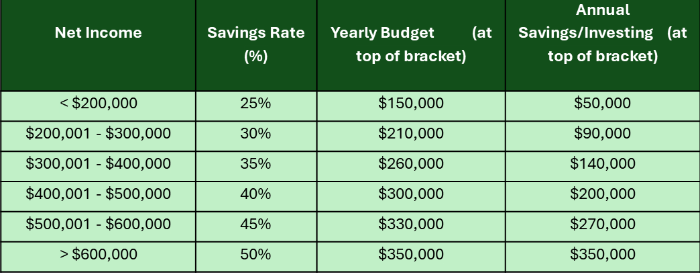 I believe all physicians should save AT LEAST 25% of their net income, and their savings rate should increase as their income increases. For example: