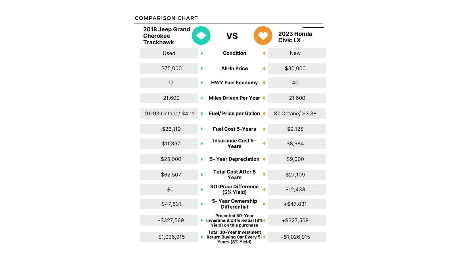 I wanted to study the actual financial impact of my car-buying decision. Obviously, the price is cheaper, but that is not the only consideration. I counted the insurance costs, gas mileage, the type of gas required, and the number of miles driven per year over 5 years. I also calculated the actual depreciation for the Trackhawk and estimated the Civic’s using a 2018 model as an example. Next, I took the price difference between the two automobiles and calculated the return on investment of that money over the course of 5 years at a 5% annualized return. Adding all this together gave me a Total Cost After 5-years of ownership, which I used to calculate a return over an additional 25 years of investing. Finally, I calculated how much you would have if you chose a Civic over a Trackhawk every 5 years for 30 years, investing the money you save.